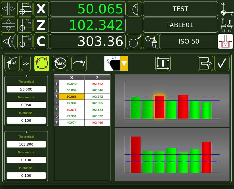 Se sono stati inseriti i valori teorici e le tolleranze per i singoli taglienti, il preset visualizzerà immediatamente la tabella di misura, evidenziando quali misurazioni sono fuori tolleranza: sarà quindi possibile, scegliendo dalla tabella il tagliente desiderato, riposizionarsi su di esso per poterlo aggiustare o sostituire.