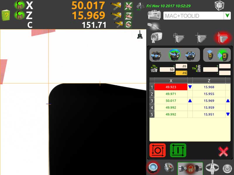 Una volta bloccato l’utensile, l’operatore dovrà semplicemente scegliere che tipo di misurazione vuole effettuare (singolo tagliente o multi-tagliente) e cosa misurare (X, Z o entrambi gli assi) ed avviare il ciclo di misura. Senza dover inserire il numero di taglienti da misurare o alcun valore teorico, a meno che non si voglia avere un report completo, il software inizierà in autonomia il ciclo e lo terminerà una volta effettuata la rotazione di 360°.