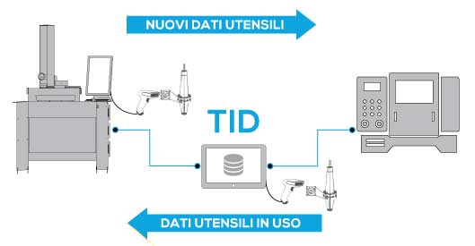 “TID identifica gli utensili tramite un codice univoco (codice TID), al quale possono essere associati tutti i dati tecnologici dell'utensile: correzione raggio, correzione lunghezza, usura, vita, etc.  Altro notevole vantaggio è che, se durante le lavorazioni l’operatore corregge le usure utensili direttamente nella tabella utensili del CN della macchina, i dati vengono aggiornati automaticamente anche sul sistema TID.”