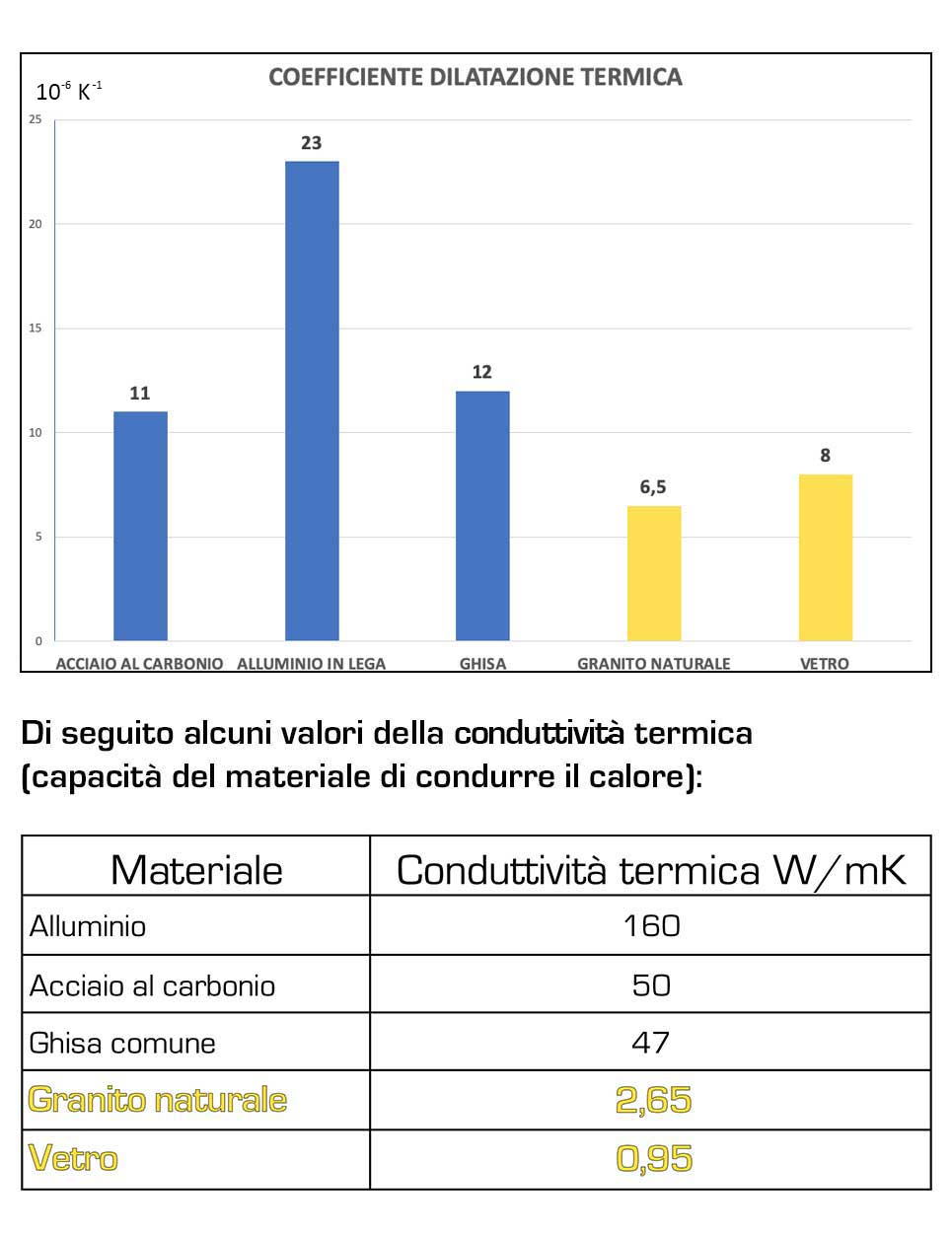 Da qui si intuisce che a parità di tempo trascorso, il riscaldamento e quindi gli allungamenti sono molto più sensibili in una massa totalmente metallica piuttosto che in una massa composta da GRANITO NATURALE e ACCIAIO.