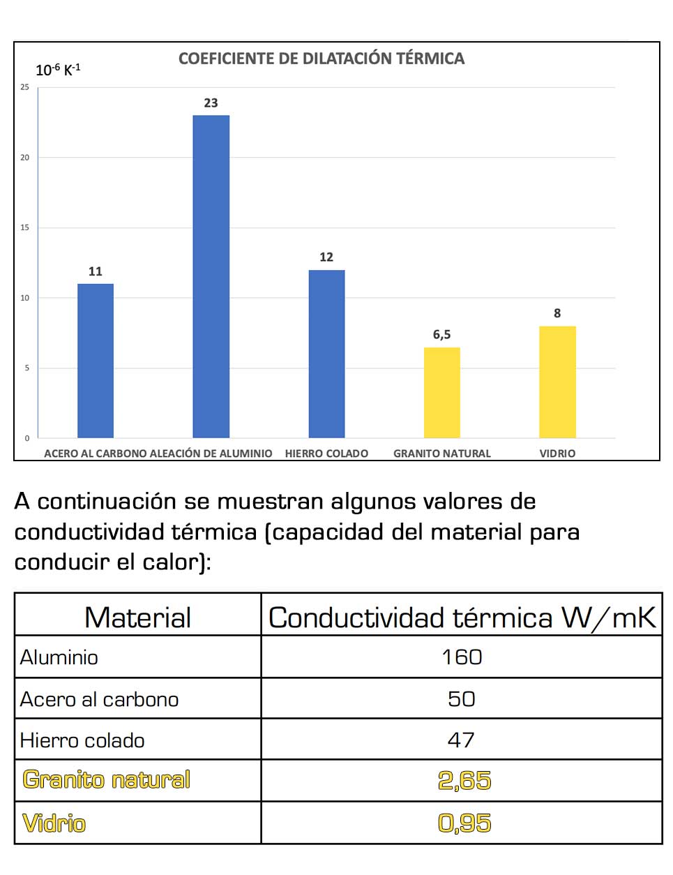 El GRANITO es un material con un bajo coeficiente de conductividad térmica (aislante muy eficaz) por lo que su temperatura varía muy lentamente al variar la temperatura del ambiente circundante (alta estabilidad térmica): en conclusión, el GRANITO NATURAL es el material por excelencia en la construcción de máquinas de medición por sus características químicas, físicas y mecánicas.