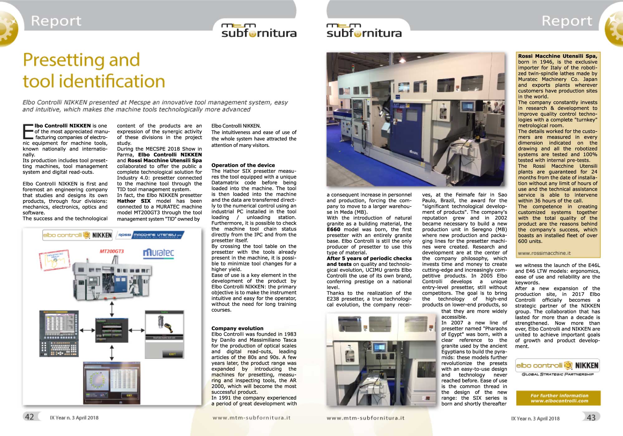 Durante a feira MECSPE 2018 em Parma, a Elbo Controlli NIKKEN e a Rossi Macchine Utensili Spa colaboraram para oferecer ao público uma solução tecnológica completa para a Indústria 4.0: máquina para pré-ajustagem e aferição de ferramentas ligada à máquina ferramenta através do sistema de gestão de ferramentas TID.