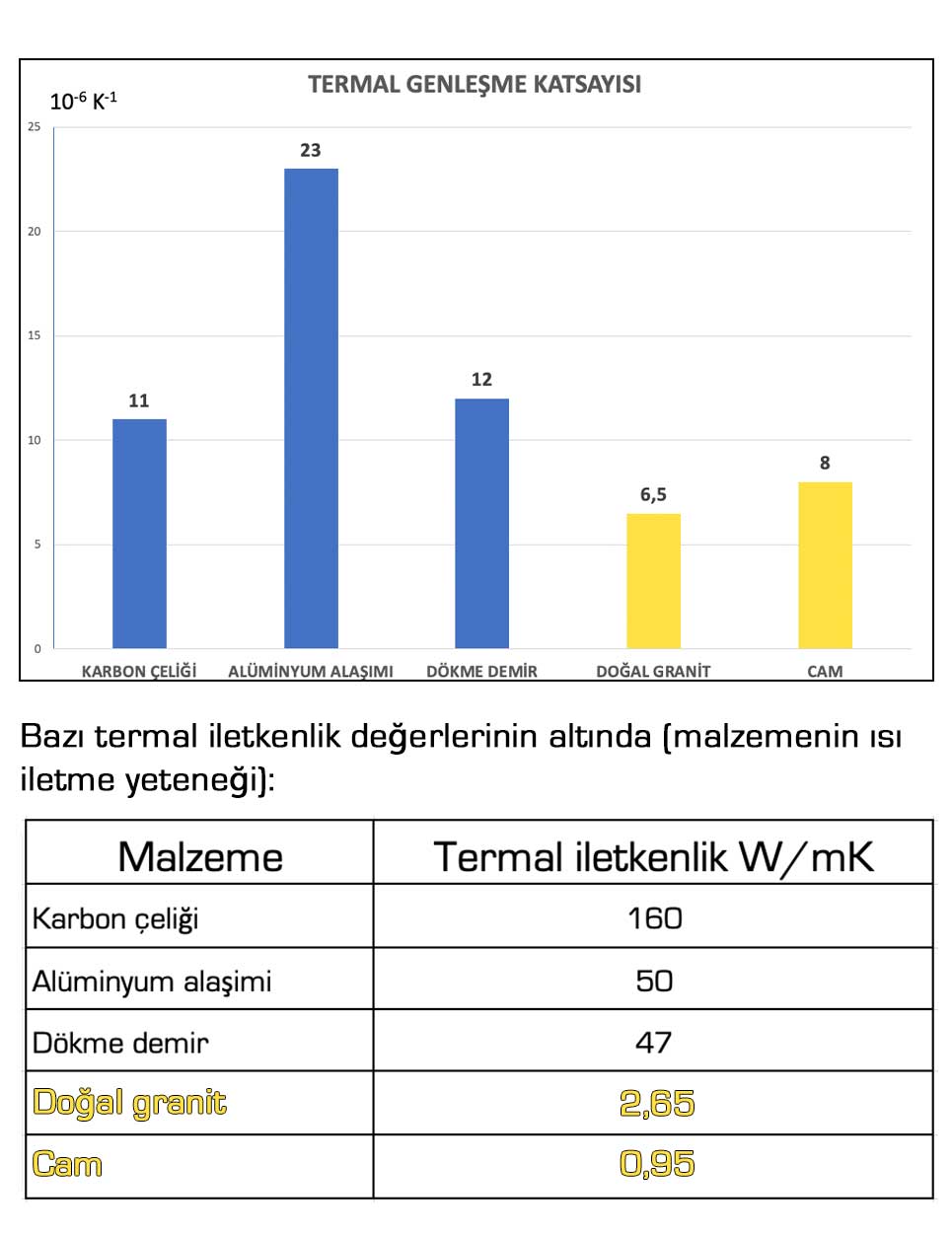 DOĞAL GRANİT düşük bir termal iletkenlik katsayısına sahip (mükemmel bir yalıtkan) olduğundan sıcaklığı, çevredeki ortamın sıcaklığı değiştikçe çok yavaş değişir (yüksek termal kararlılık): Sonuç olarak DOĞAL GRANİT, ölçüm makineleri yapımında kimyasal / fiziksel ve mekanik özellikleri nedeni ile mükemmel bir malzemedir.